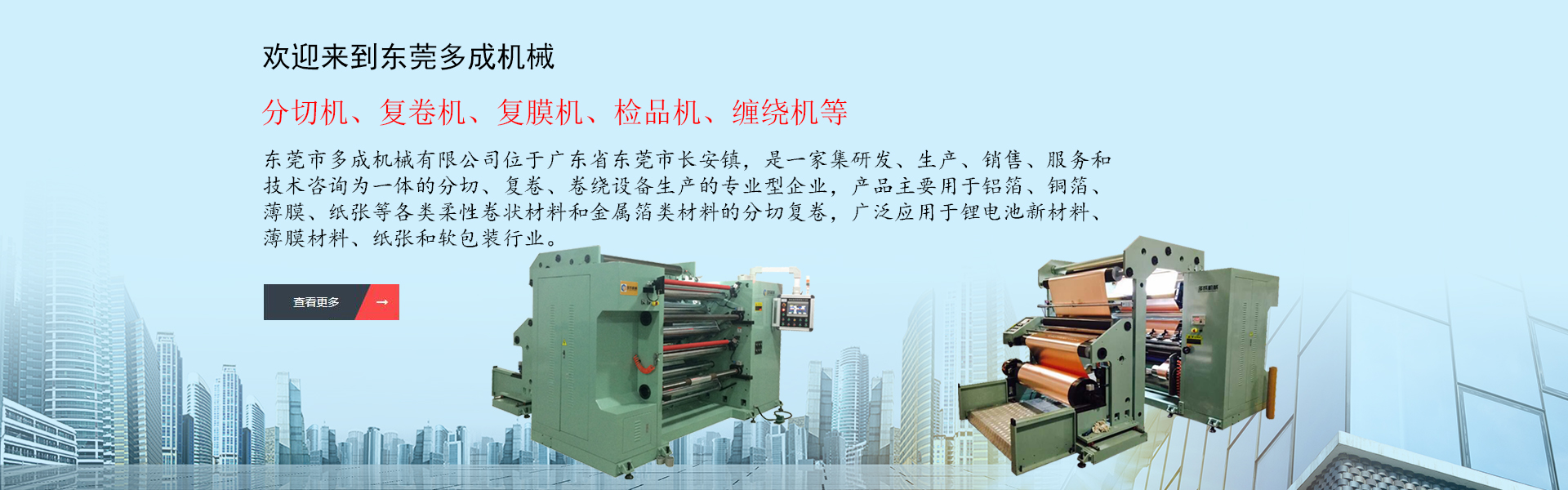 東莞市多成機械有限公司位于廣東省東莞市長安鎮(zhèn),是一家集研發(fā)、生產(chǎn)、銷售、服務(wù)和技術(shù)咨詢?yōu)橐惑w的分切、復(fù)卷、卷繞設(shè)備生產(chǎn)的專業(yè)型企業(yè),產(chǎn)品主要用于鋁箔、銅箔、薄膜、紙張等各類柔性卷狀材料和金屬箔類材料的分切復(fù)卷,廣泛應(yīng)用于鋰電池新材料、薄膜材料、紙張和軟包裝行業(yè),產(chǎn)品范圍有分切機、復(fù)卷機、復(fù)膜機、檢品機、纏繞機等,是國內(nèi)外分切卷繞設(shè)備專業(yè)供應(yīng)商。